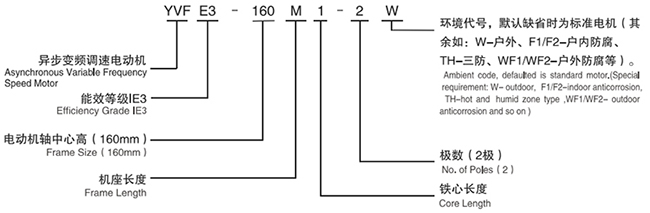 以YVFE3-132S2-2為例:YVFE3—電機(jī)型號(hào),YVF表示變頻調(diào)速,E3表示IE3超高高效率;132—中心高;S—機(jī)座長(zhǎng)度代號(hào);2—鐵芯長(zhǎng)度代號(hào);2—電機(jī)極數(shù)。