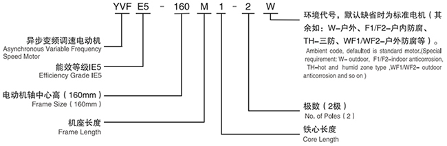 在這里西瑪品牌電機以YVFE5-160M1-2W為例:YVFE3—電機型號,YVF表示變頻調(diào)速,E4表示IE4超高高效率;160—中心高;M—機座長度代號;1—鐵芯長度代號;2—電機極數(shù)。W-戶外使用。